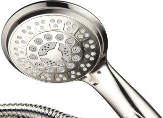 HotelSpa 9-Setting brushed nickel hand shower review — powerful 9 sprays, tools-free install, patented pause switch, watersaving modes, durable low-maintenance.
